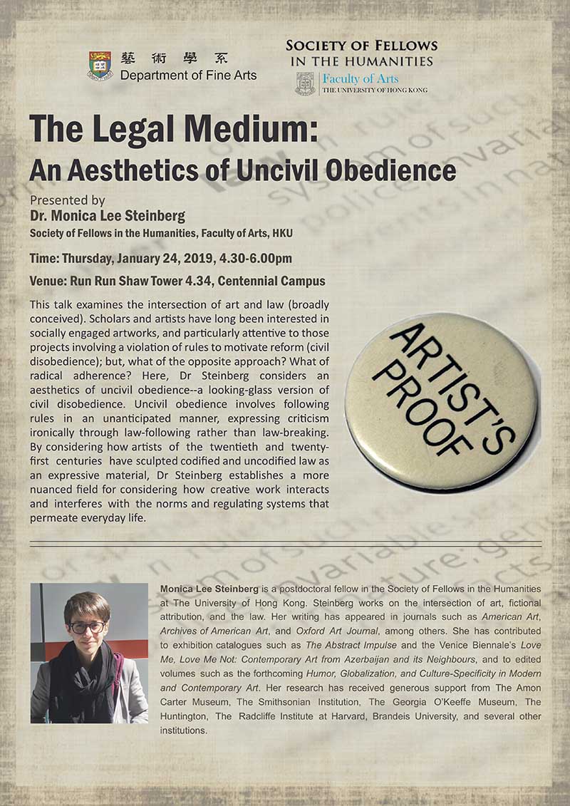 “The Legal Medium: An Aesthetics of Uncivil Obedience,” Department of Fine Arts Lecture Series, University of Hong Kong, HK (January 24, 2019).