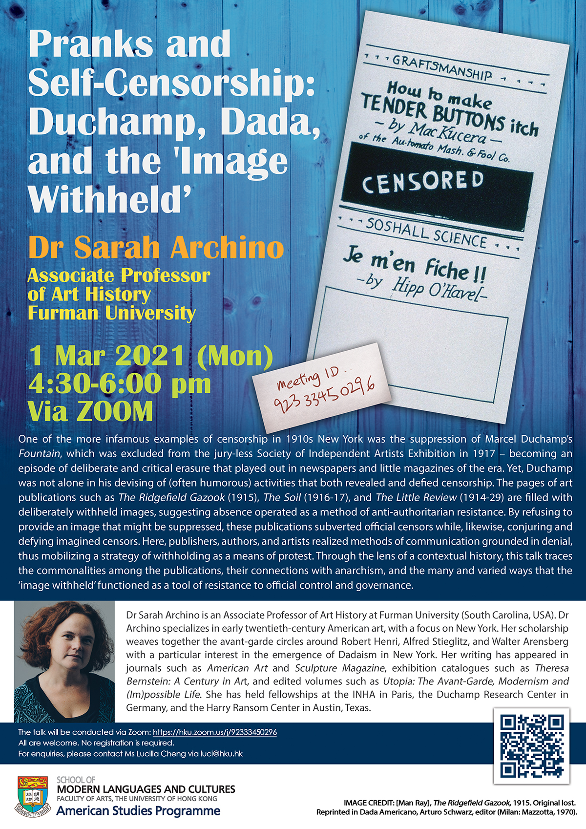 Organizer of: Sarah Archino, Furman University, “Pranks and Self-Censorship: Duchamp, Dada, and the 'Image Withheld'," School of Modern Languages and Cultures, University of Hong Kong (March 1, 2021).